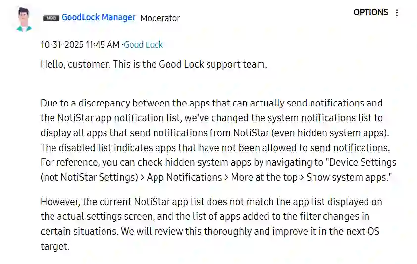 Samsung confirmed two Notistar-related fixes coming with the One UI 9 upgrade. The next major update will fix the long list of unusable system apps in the Application List section under the Setting menu by hiding unnecessary apps.