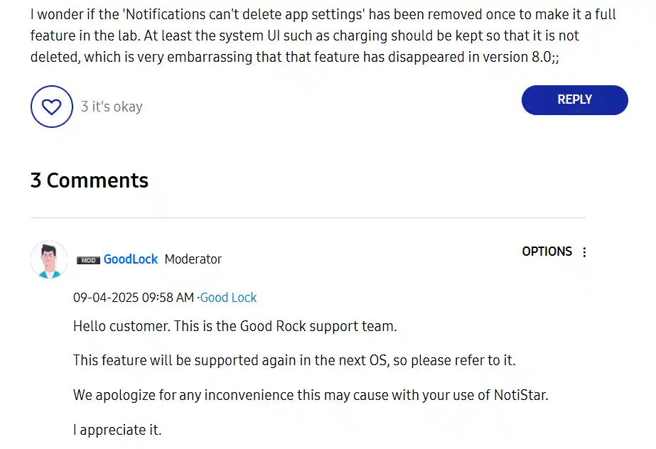 Another moderator confirms the return of the “Set app unable to clear notifications” option in the Notistar settings. The feature existed till One UI 7 and was removed from One UI 8, and now it will again be available from One UI 9.